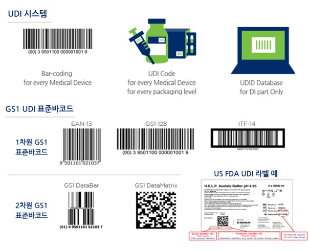 GS1Àº US FDA¿¡¼ ÀÎÁ¤ÇÑ UDI Ç¥ÁØÀ¸·Î¼, ±¹Á¦Ç¥ÁØ »óǰ½Äº°ÄÚµåÀÎ GTIN°ú GS1 ÀÀ¿ë½Äº°ÀÚ(AI, Application Identifier)¸¦ ÀÌ¿ëÇÏ¿© UDI Äڵ带 »ý¼ºÇÒ ¼ö ÀÖÀ¸¸ç, ÀÇ·á±â±â °ø±Þ¸ÁÀÇ ¹ÙÄÚµå ȯ°æ¿¡ µû¶ó 1Â÷¿ø ¶Ç´Â 2Â÷¿ø ¹ÙÄڵ带 »ç¿ëÇÒ ¼ö ÀÖ´Ù.